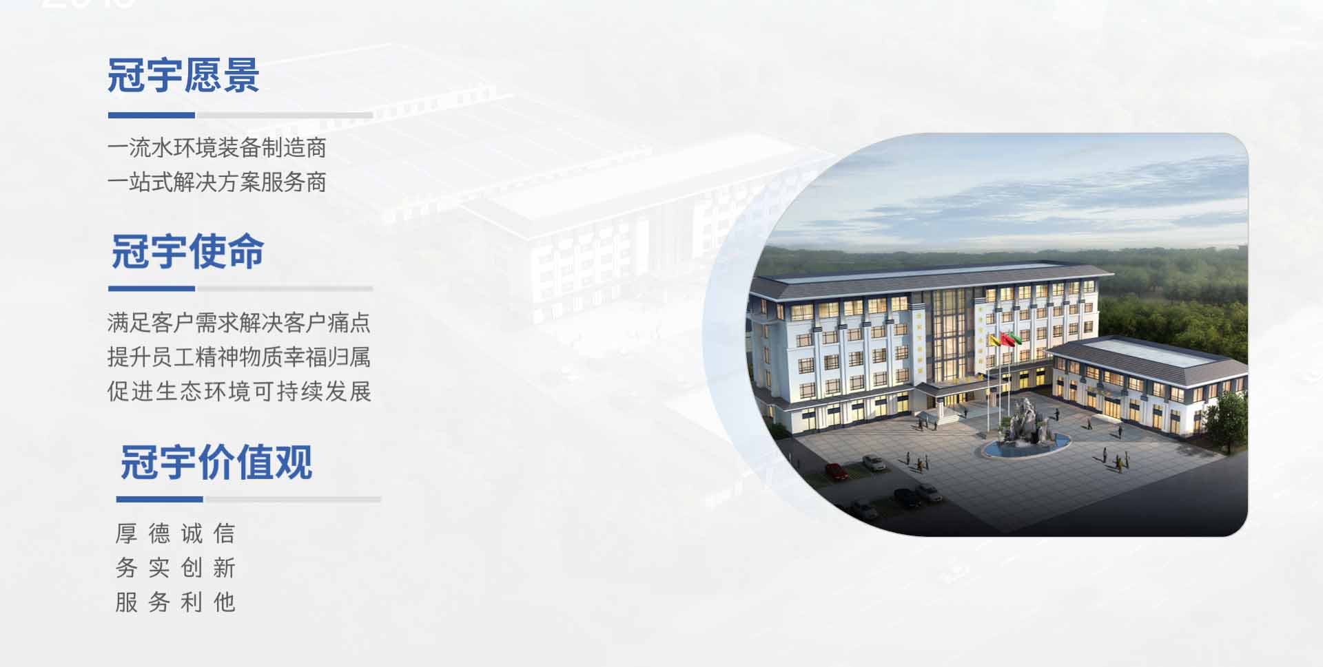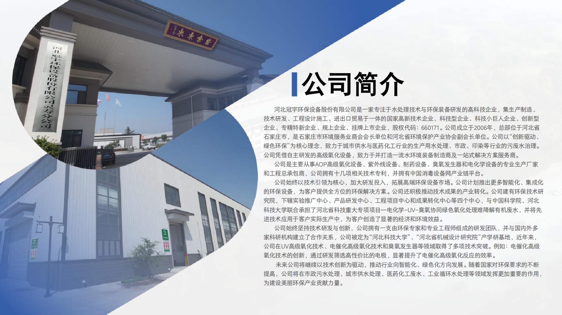 河北冠宇環(huán)保設(shè)備股份有限公司是一家專注于水處理技術(shù)與環(huán)保裝備研發(fā)的高科技企業(yè),集生產(chǎn)制造、技術(shù)研發(fā)、工程設(shè)計施工、進(jìn)出口貿(mào)易于一體的國家高新技術(shù)企業(yè)、科技型企業(yè)、科技小巨人企業(yè)、創(chuàng)新型企業(yè)、專精特新企業(yè)、規(guī)上企業(yè)、掛牌上市企業(yè),股權(quán)代碼:660171。公司成立于2006年,總部位于河北省石家莊市,是石家莊市環(huán)境服務(wù)業(yè)商會會長單位和河北省環(huán)境保護(hù)產(chǎn)業(yè)協(xié)會副會長單位。公司以“創(chuàng)新驅(qū)動、綠色環(huán)?!睘楹诵睦砟睿铝τ诔鞘泄┧c醫(yī)藥化工行業(yè)的生產(chǎn)用水處理、市政、印染等行業(yè)的污廢水治理。公司憑借自主研發(fā)的高級氧化設(shè)備,致力于并打造一流水環(huán)境裝備制造商及一站式解決方案服務(wù)商。